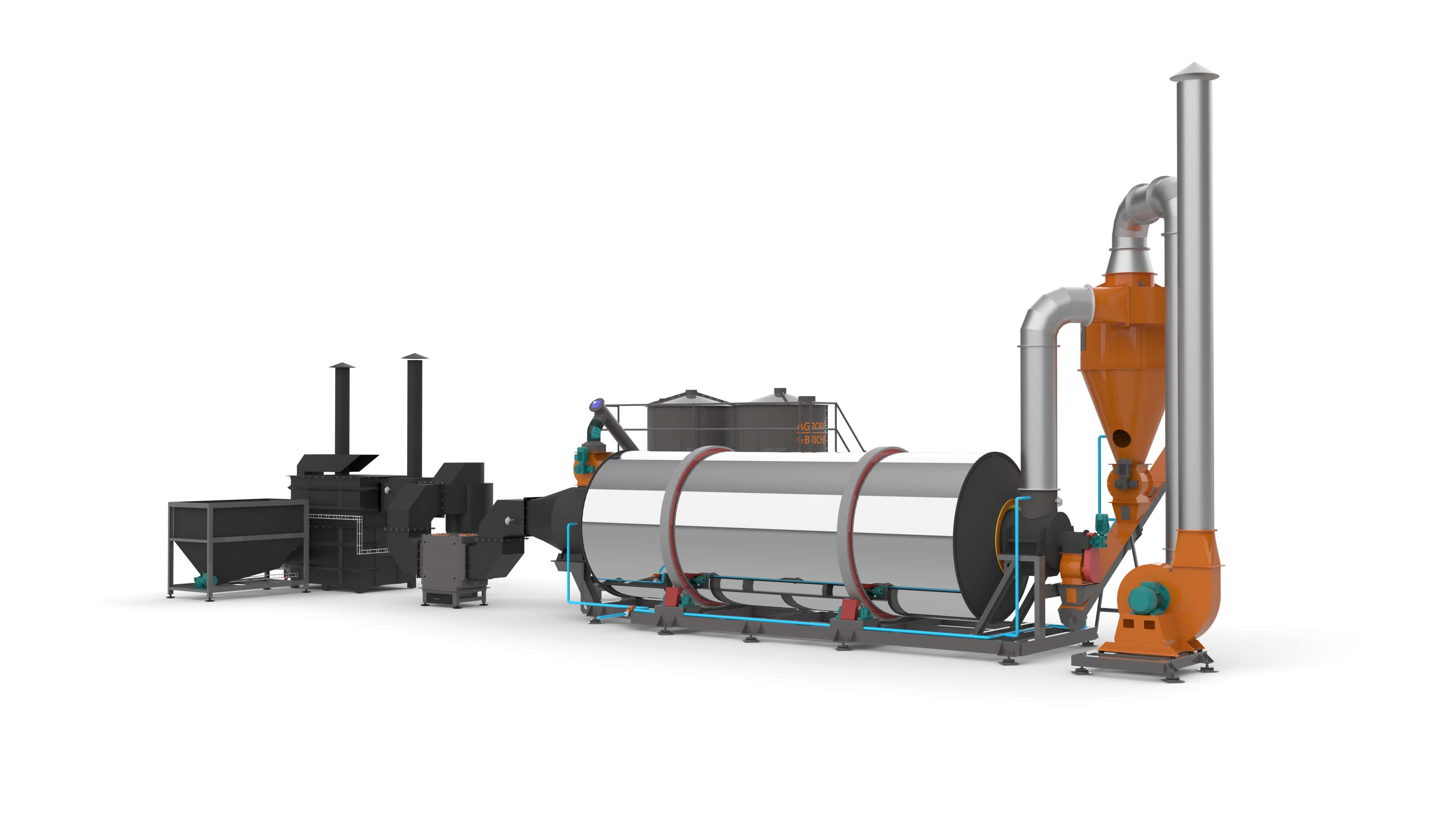 Procesul de uscare: materia prima umeda cu ajutorul aerului cald trece prin tubul rotativ compus din 3 camere de uscare in forma de serpentine, unde amestecăndu-se isi pierde umiditatea. Apoi, materia prima uscata cade din ciclonul cu valva rotativa, iar aerul de umed este ventilat în atmosfera prin ventilator.
